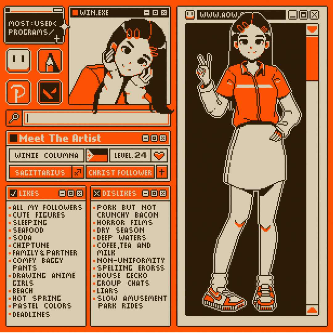 I'm a 24-year-old freelance pixel art illustrator and animator, known for use of limited color palettes and retro-inspired style. With five years of experience, I specialize in indie games, music albums, music video animations, intro animations, logo animations, and character design.